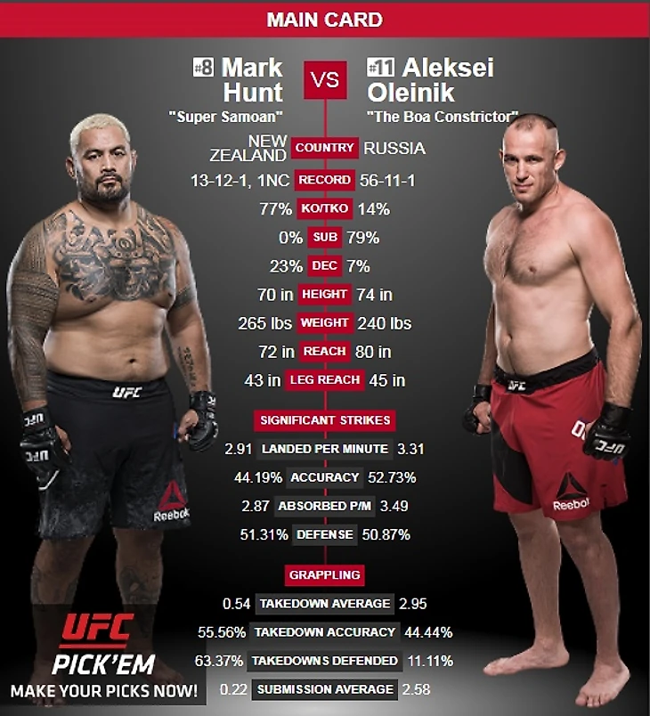 Это будет триллер по напряжению! Хант может оторвать голову в любой момент, а Олейник удушить из любого положения. Они оба криптонит для друг друга: Марк слаб в борьбе, Алексей в стойке в соотношении к друг другу. Но Алексей более вариативный и ловкий, также он намного выносливее Ханта, однако он много пропускате в стойке! Как итог: Алексей будет крайне осторожен и заберёт бой по очкам, но есть шанс на болевой.