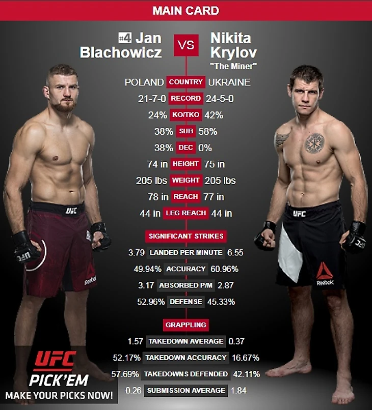 Восходящая звезда полутяжёлого дивизиона Никита Крылов, который абсолютно внезапно для всех ушёл из UFC вернулся вновь, чтобы сразится с "внезапно" ворвавшимся в топ #5 Яном Блаховицем.