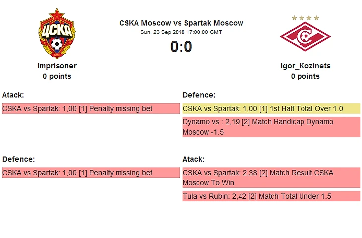 Ну и главный матч тура в реале, ЦСКА против Спартака, уверен зрелище будет подабающее, что там что тут, ведь в этой паре Imprisoner vs Igor_Kozinets тоже будет решаться судьба борьбы за медали, проиграй любой из них и наверное уже можно крест ставить на турнире.