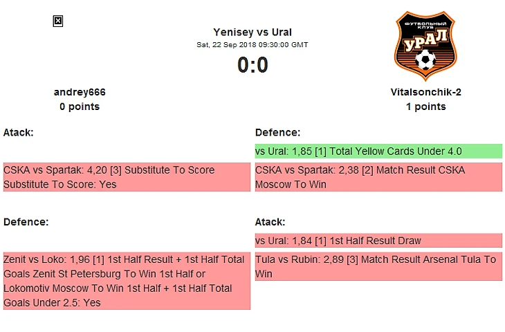 Начнется тур в субботу в этот раз, andrey666 у которого бонусные 3 очка фактически в кармане примет дома уральского головореза Витальсончика, правда это не совсем оригинальный Виталь, всего лишь его копия, которую к тому же похоже произвели даже не в Китае, а похоже где то в Индии, иначе как объяснить тот факт что он только в прошлом туре забрал первую победу ?