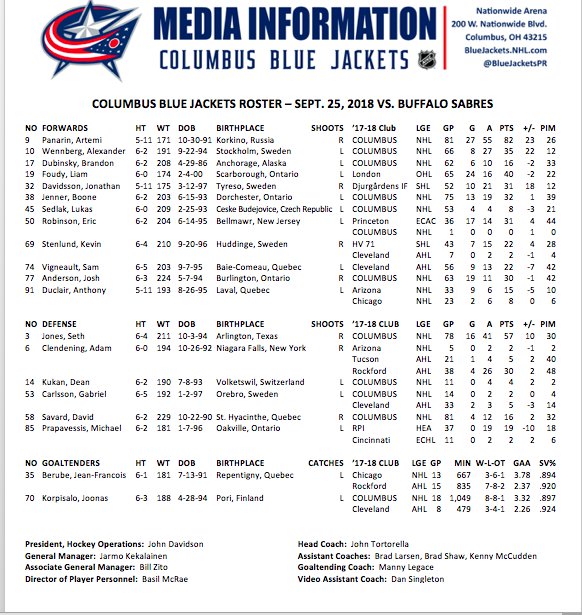 Вот за что я люблю НХЛ, так это за антураж. Даже вокруг предсезонных матчей, ажиотаж вокруг матчей просто сумасшедший. Это я к тому, что найти составы на 12 часов до матча, не является большой проблемой, если вы владеете "матч-частью". Вот вам состав Коламбуса:
