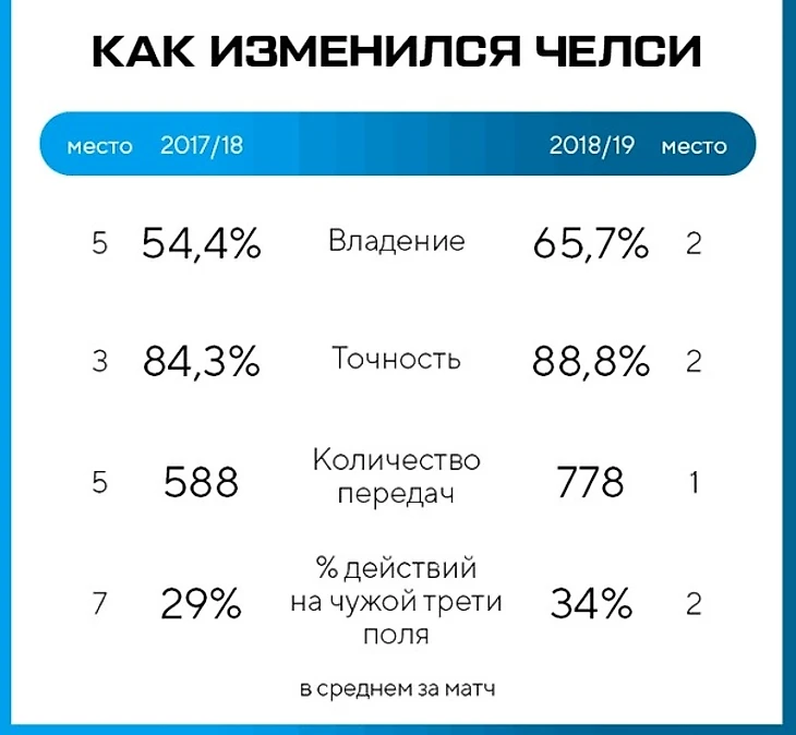 А с учетом того, что кадровые изменения практически отсутствуют (вместо Куртуа куплен Кепа + вместе с Сарри пришел Жоржиньо, вот пожалуй и все), то работа проделанная итальянским наставником и вовсе выглядит фантастической.