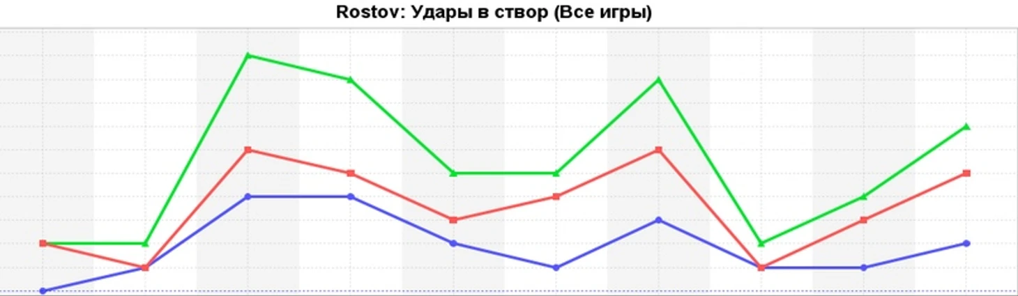 7 раз Ростов побеждал по данному показателю, 2 раза ничья, и лишь один раз проигрывал. Соперники при этом ни разу не наносили больше 4.5 ударов в створ ворот Ростова