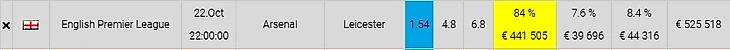 Букмекеры сообщают, что игроки больше всего ставок разместили на победу Арсенала - 95% от общего объема ставок на матч, на ничью пришлось 3% ставок, а на победу Лестера принято 2% ставок.