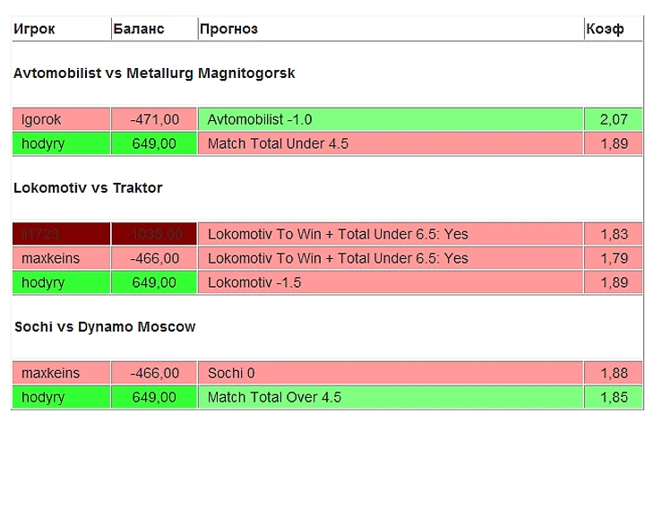 По ставкам участников турнира все опять было печально - ставок было немного, но большинство из них ушли в молоко. art_ural я так понимаю сосредоточился на ЛЧ и пропустил день, может быть и не зря. Те же, кто понадеялся на легкие победы Авангарда и СКА оказались в проигрыше.
