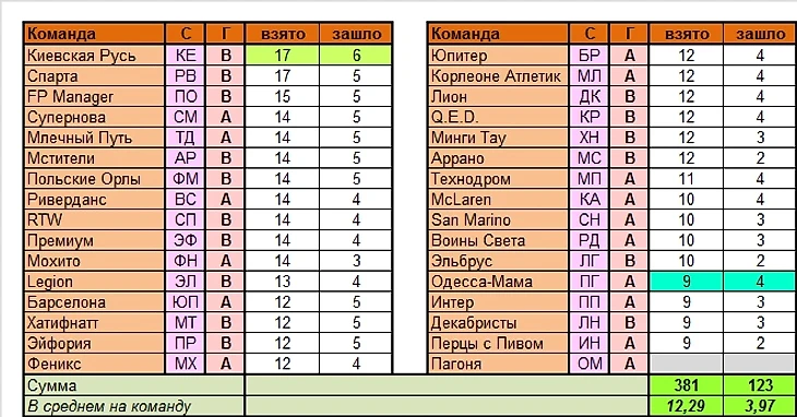 Лучшая команда тура по сумме УВ в целом: Одесса-Мама (19 вариантов)