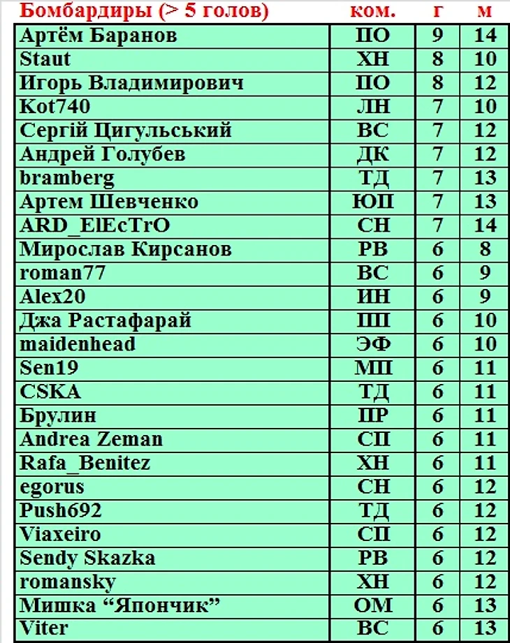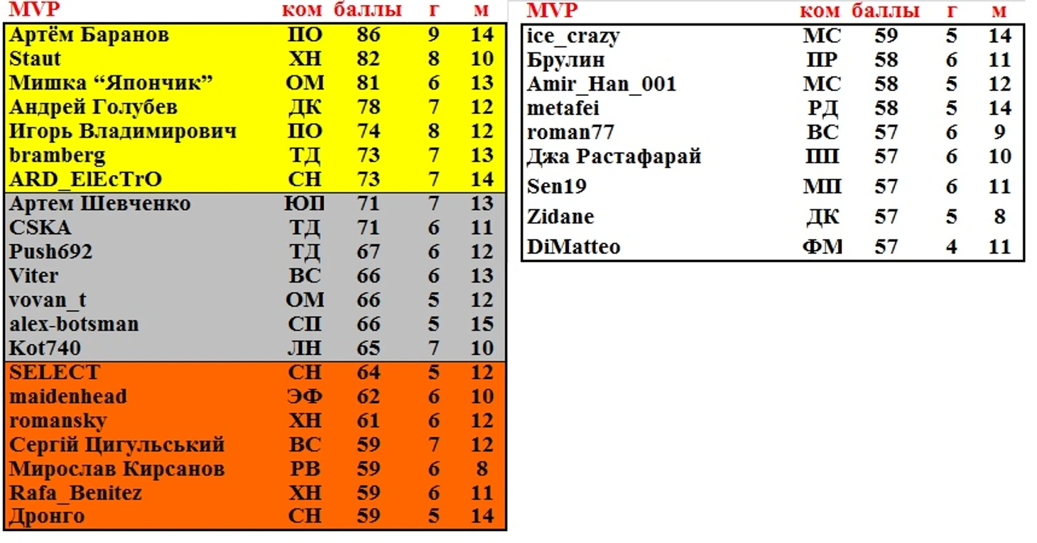 Перед игровыми парами на 11 тур публикую списки лучших бомбардиров и игроков по mvp на момент начала игры.