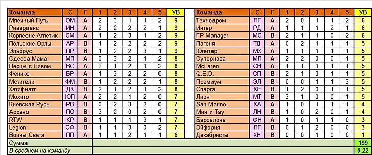 Лучшие команды тура по сумме УВ в целом: Млечный Путь, Риверданс, Корлеоне Атлетик, Польские Орлы (по 9 вариантов)