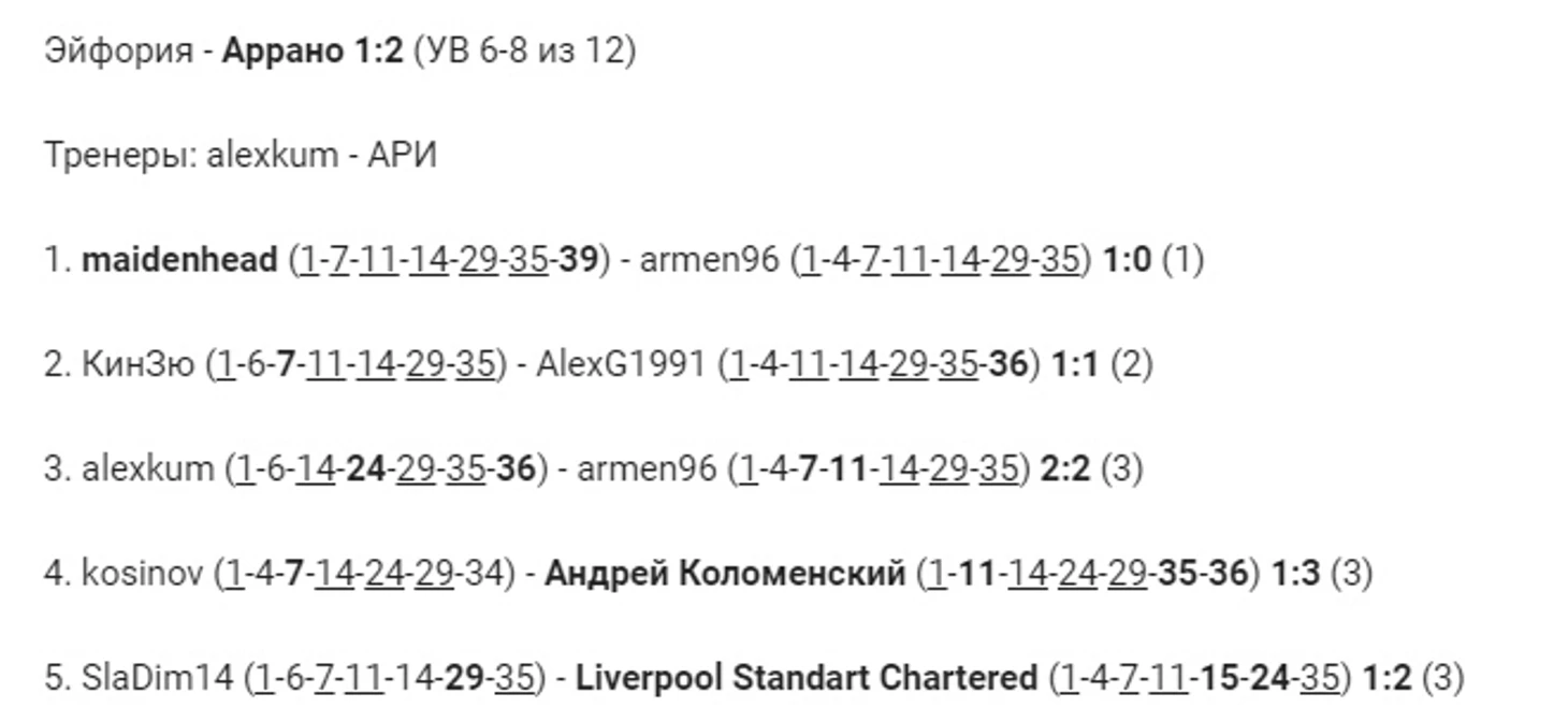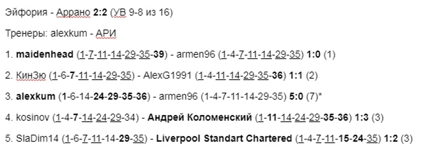 Перед публикацией выкладок по 1/4 финала Кубка Ямато отметим определённые моменты 12-го тура командного чемпионата (Апертуры-2018), проходившим на МДП Шахтёр Д - Динамо К (https://www.sports.ru/betting/blogs/2233595.html ). В матче Эйфория - Аррано было выявлено нарушение формирования заявки со стороны команды Аррано: один и тот же игрок (armen96) фигурировал на 2 линиях, 1-ой и 3-ей.