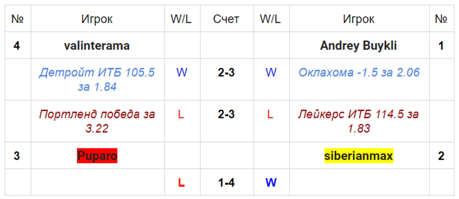 Пока siberianmax отдыхает и празднует День благодарения) Видар встречается с valinterama и счет в серии уже 3-2 в пользу первого сида Запада, теперь valinterama в очень трудном положении, ему нужно во первых обязательное поражение Видара, а во вторых - самому точно спрогнозировать и желательно с высоким кэфом. И помнить что есть штраф - 7 игра, а значит хозяева принимают и гости со штрафами!