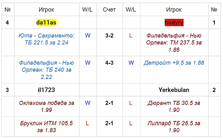 А вот и сенсация подъехала! hodyry перед серией с da11as был в шикарной форме и правила ему благоволили, настроенные как раз для того что бы фавориты регулярки не влетали чудом в плейофф. Но, hodyry не спасся, в 5 и 6 игре da11as выдал две шикарные ставки и взял серию 4-3 у себя дома в 6-й игре! Стоит только поаплодировать ему, имея огромный штраф в почти 0.40 к кэфам, он сумел найти высокие коэффициенты и главное - точно их спрогнозировать. Такой же он уж аутсайдер против терпящих бедствие пары Ильяс - Еркебулан!?