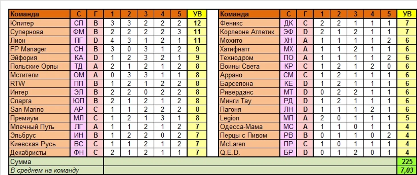 Лучшая команда тура по сумме УВ в целом: Юпитер (12 вариантов)