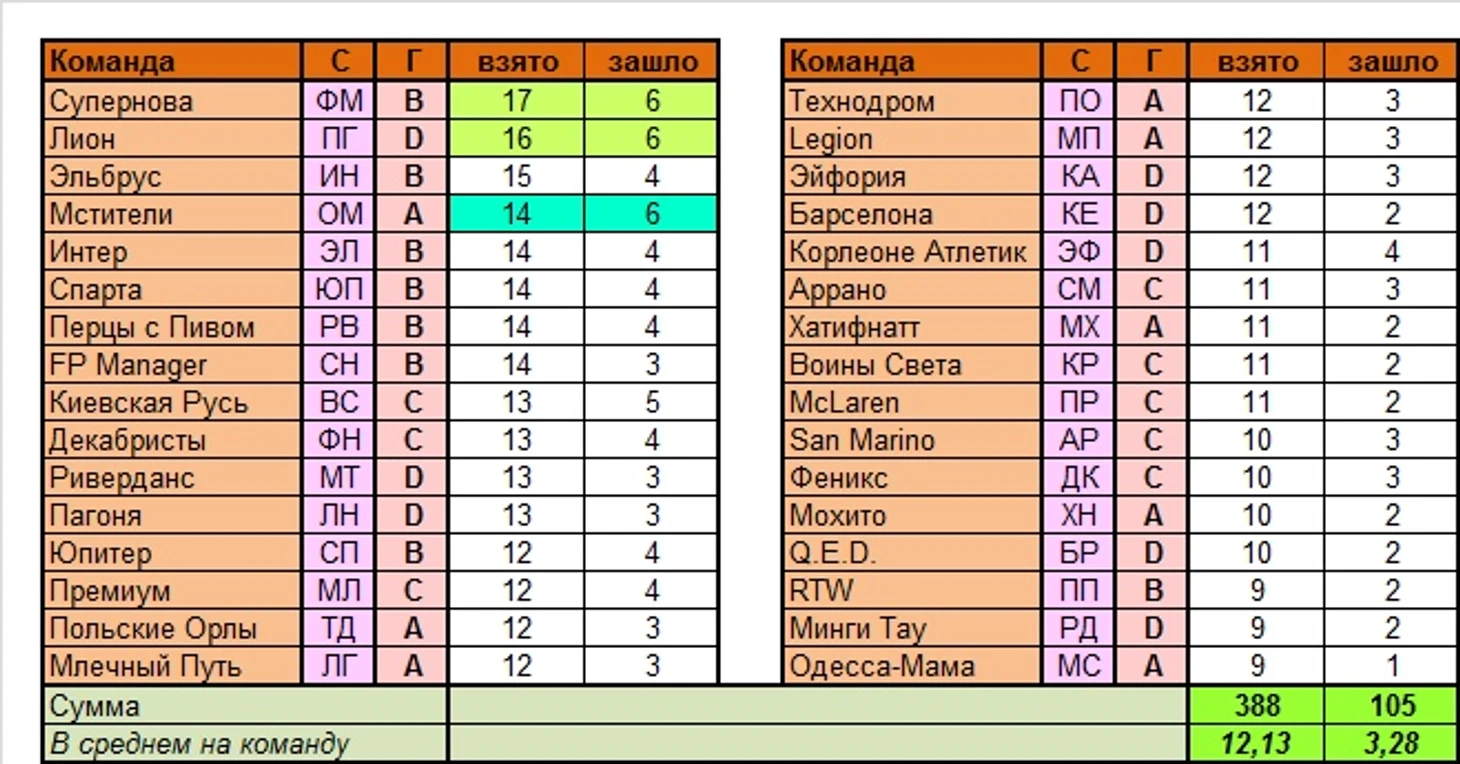 Команды, использовавшие наименьшее число вариантов: RTW, Одесса-Мама, Минги Тау (по 9 вариантов)