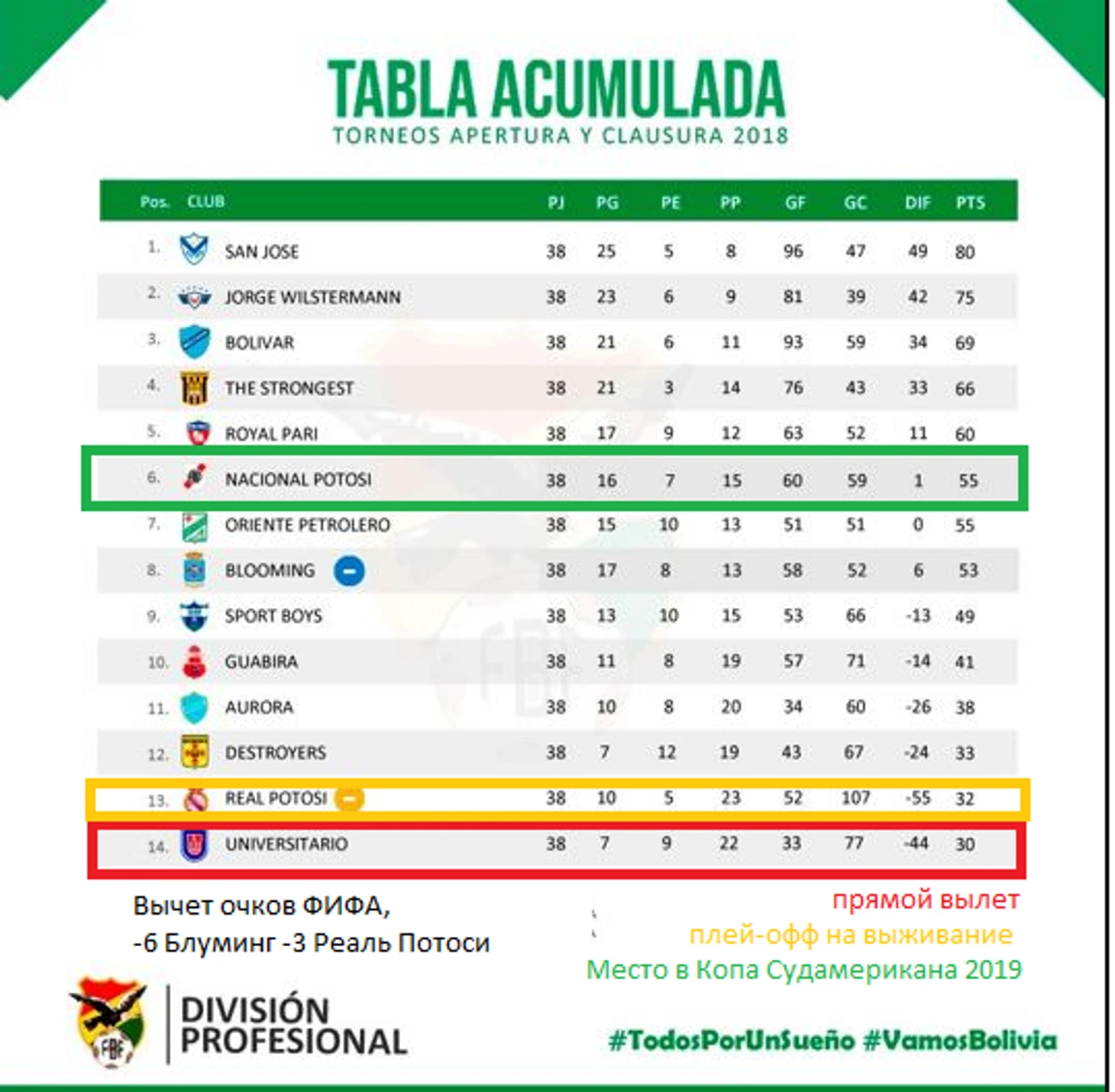 Концовка сезона выдалась жаркая — в верхней части таблицы четыре команды реально претендуют на чемпионство, в её середине сразу три клуба ведут борьбу за последнее оставшееся место в Копа Судамерикана — 2019 (далее — КС-19), а спастись от прямого вылета пытаются сразу три команды. Именно по этой причине здесь очень интересно будет сыграть на мотивации команд, и ждать унылого ковыряния на своей половине не стоит ни в одном матче. Обзор будет покомандный, так как мысли, здесь изложенные, логично будет применить и при ставках на последний тур. Прежде чем начать, стоит обозначить, что главный неудачник сезона и последний участник КС-19 от Боливии будут определены по сводной таблице за Апертуру и Клаусуру (особенность всех южноамериканских стран кроме Аргентины и Бразилии). Ниже приведу именно эту сводную таблицу, которой, кстати, вы не найдете на русскоязычных агрегаторах.