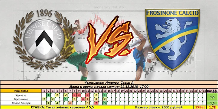 Мы видим по статистике и команд, и рефери, что матч конечно может сложиться по-всякому: и Паоло Валери может начать выдавать предупреждения направо и налево, и Фрозиноне может взять да и получить 6 карточек на команду. Однако вероятность этого Жёлтый слон оценивает пониже, чем букмекеры, поэтому решил взять ставку тотал жёлтых карточек меньше 5.5 с коэффициентом 1.78. Размер ставки рекомендуется средний - в 2.5% банка.