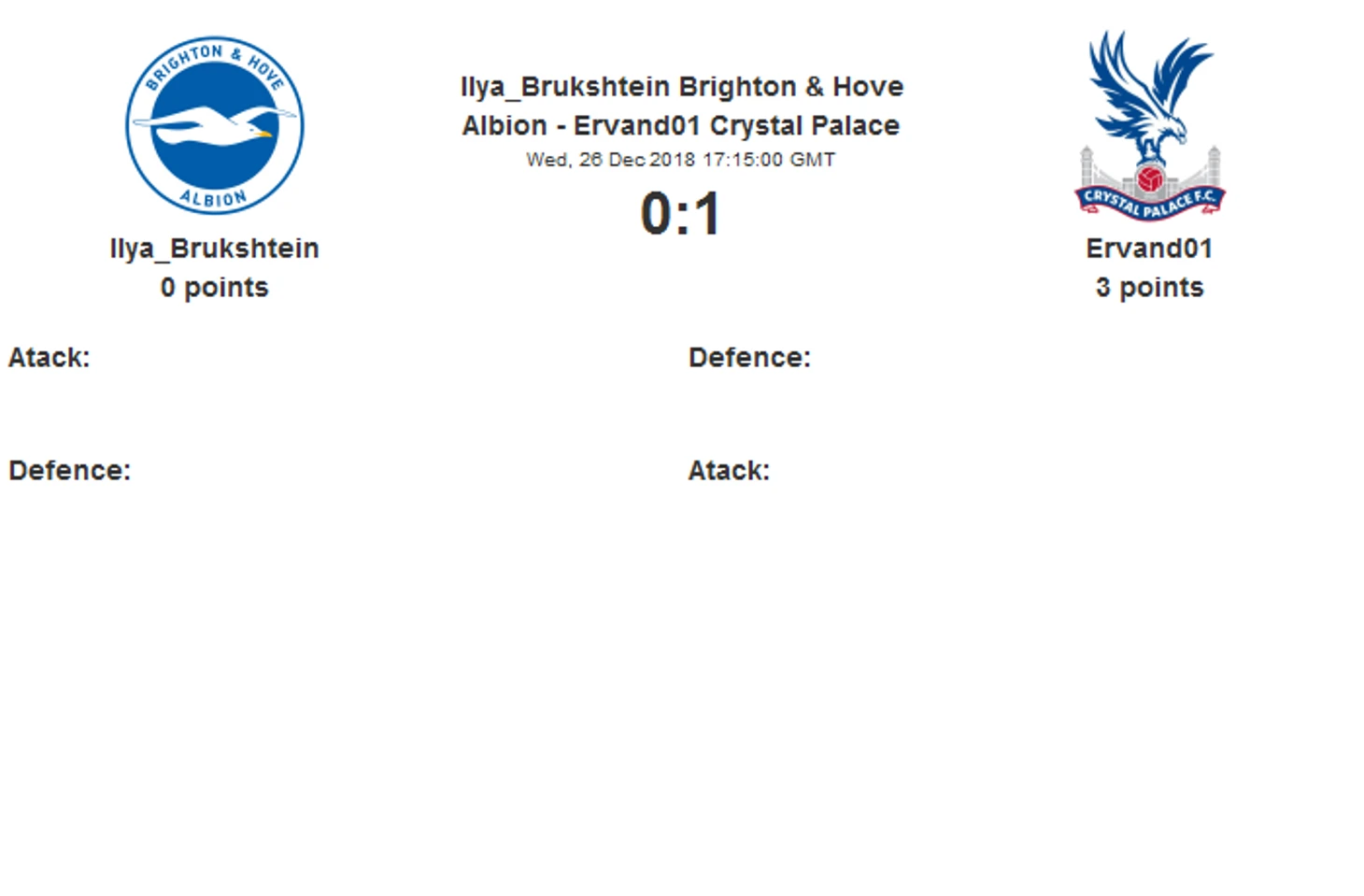 Брайтон Ilya_Brukshtein примет Кристал Пэллас Ervand01. В таблице на очко впереди Ervand01, Илья постабильнее если смотреть на заходы и голы..