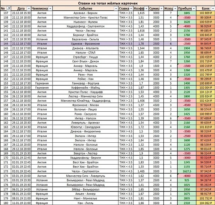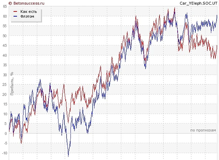 Обращает на себя внимание большое количество проигрышей по крупным, казалось бы, более надёжным ставкам. Перекос и статистические выбросы настолько велики, что впервые за 3 сезона прибыльность при ставках флетом превысила прибыльность при ручном управлении размерами ставок, причём уже почти на 15%.