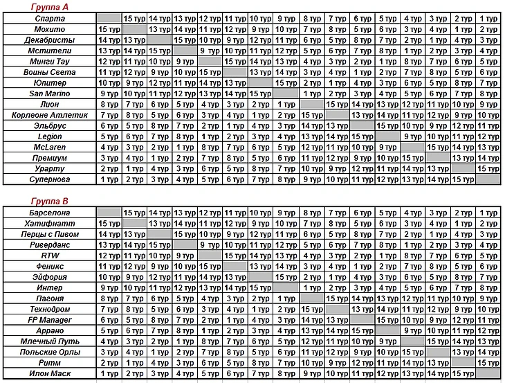 После второй корзины группа А состоит из команд Спарта, Мохито, Декабристы, Мстители.