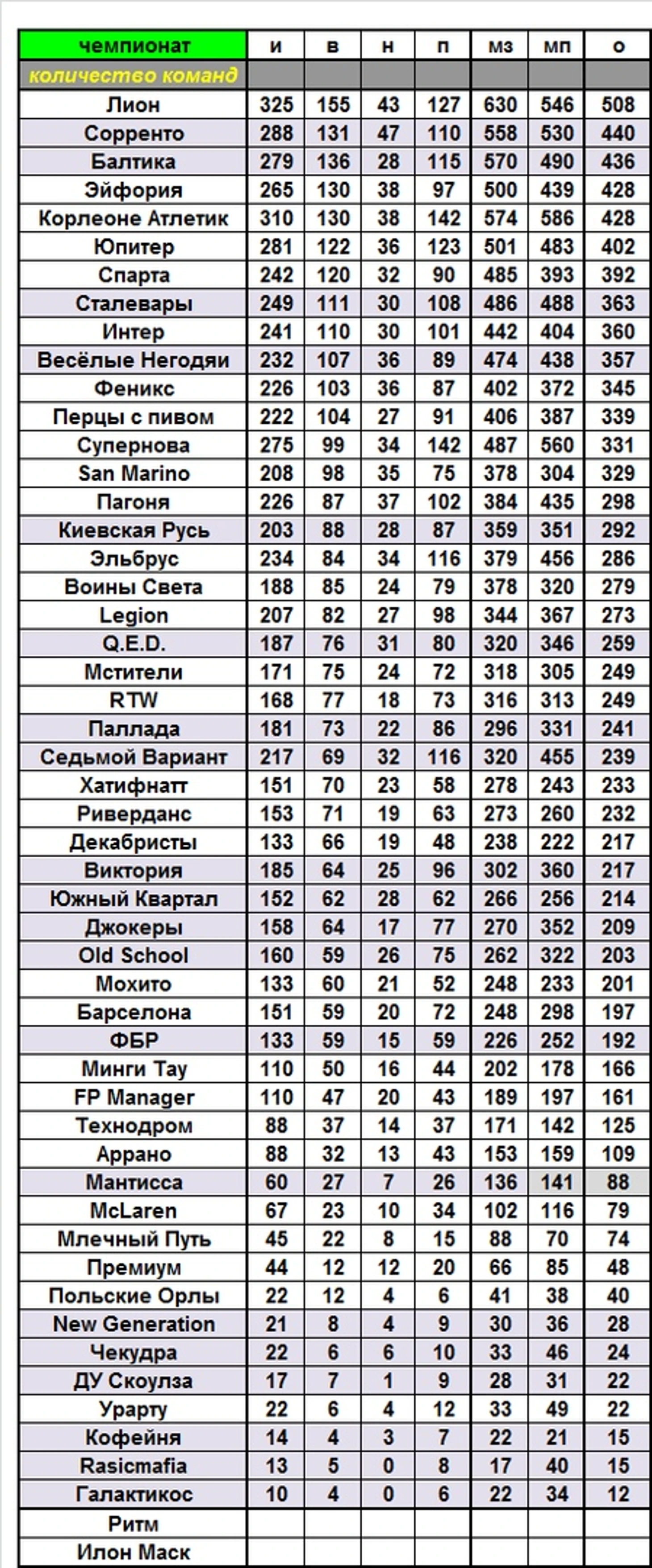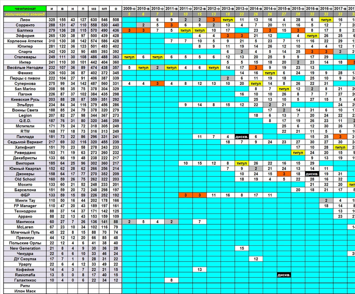 Мы вступаем в 20-ый игровой сезон в истории рублогов и спортса, накануне старта нового чемпионата представляю данные всех реальных команд за предыдущие командные циклы.