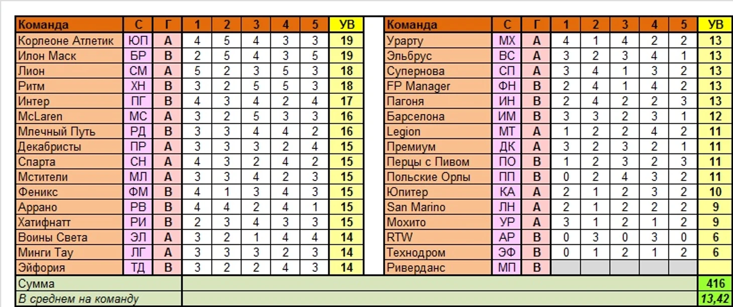 Лучшие команды тура по сумме УВ в целом: Корлеоне Атлетик, Илон Маск (по 19 вариантов)