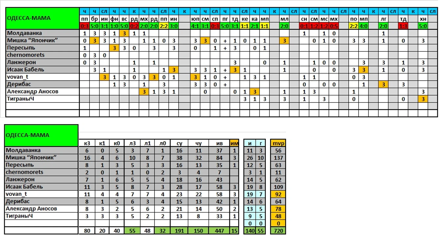 Расставлены команды в порядке сезонного рейтинга по возрастанию. Начинаем с последней строчке, на нём располагается дисквалифицированная Одесса-Мама. Поскольку в ней выступали и реальные игроки, я посчитал уместным опубликовать и её карточку.