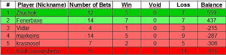Чтобы посмотреть ставки игроков надо зайти на веб-сайт http://flat-run.com/NewTips?tournament=211 . Там ты увидишь предстоящие матчи и ставки игроков на них, напомню что список постоянно пополняется новыми ставками, так что проверяйте обновления регулярно.