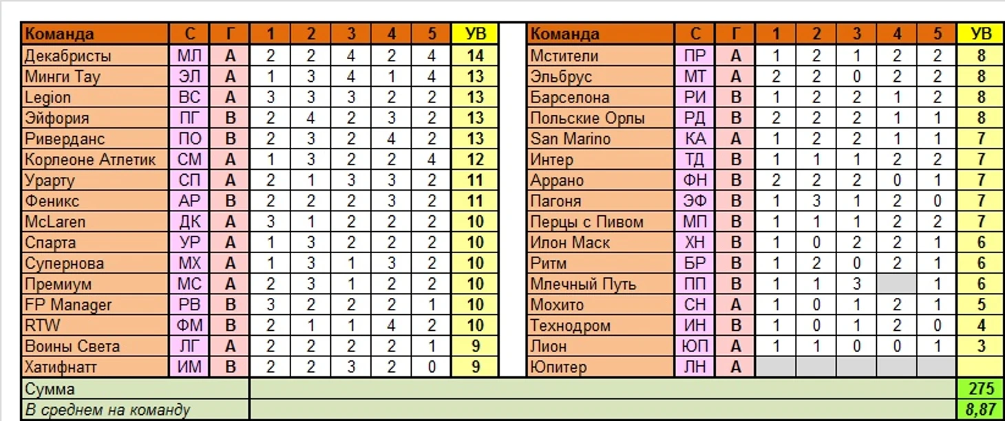 Лучшая команда тура по сумме УВ в целом: Декабристы (14 вариантов)