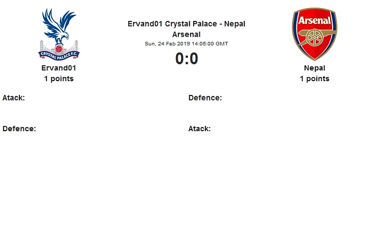 Crystal Palace Ervand01 вошел во вкуси вновь в топе со старта. ArsenalNepal пока уступает своему сопернику по очкам, но понимание футбола у него не отнять. Так что победить вышестоящей команде будет непросто.