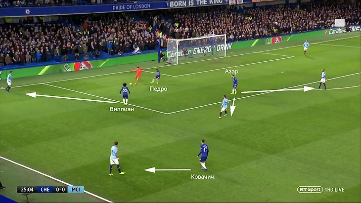 Затем Маурицио вмешался и изменил структуру давления. Теперь вингеры Педро и Виллиан прессинговали вратаря и центральных защитников, нападающий Азар играл по Фернандиньо, а из центра поля выдвигался лишь один игрок – в данном случае Матео Ковачич на Кайла Уокера: