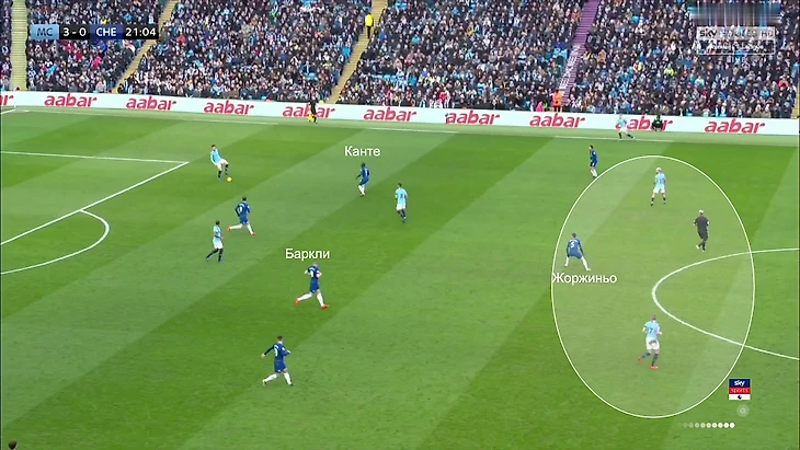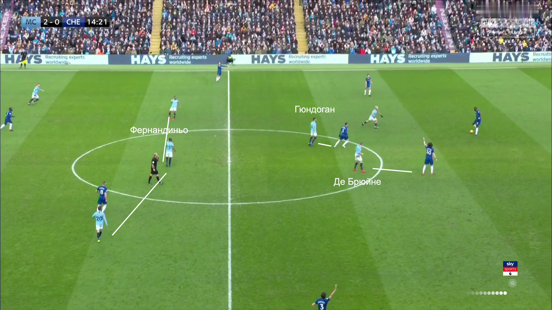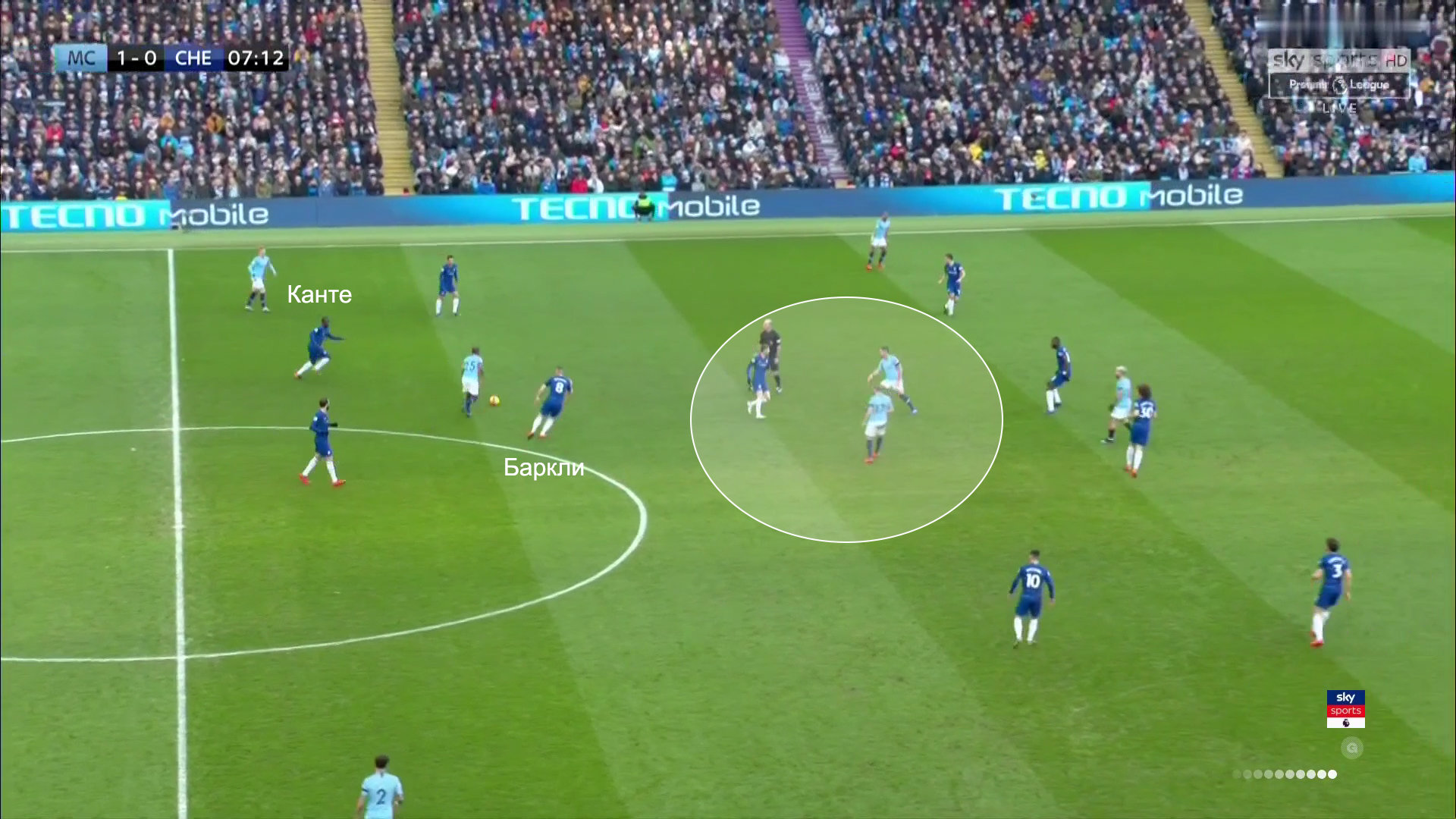 Такой прессинг менее агрессивен и не накрывает сразу всех игроков соперника в первой стадии, но дает больше стабильности в случае, если «Сити» преодолевает первую волну. Из расположения игроков очевидно, что еще двое (Канте и Жоржиньо) остаются в опорной зоне. Это сильно отличается от типичного для Сарри сценария, в котором Жоржиньо бросали на растерзание: