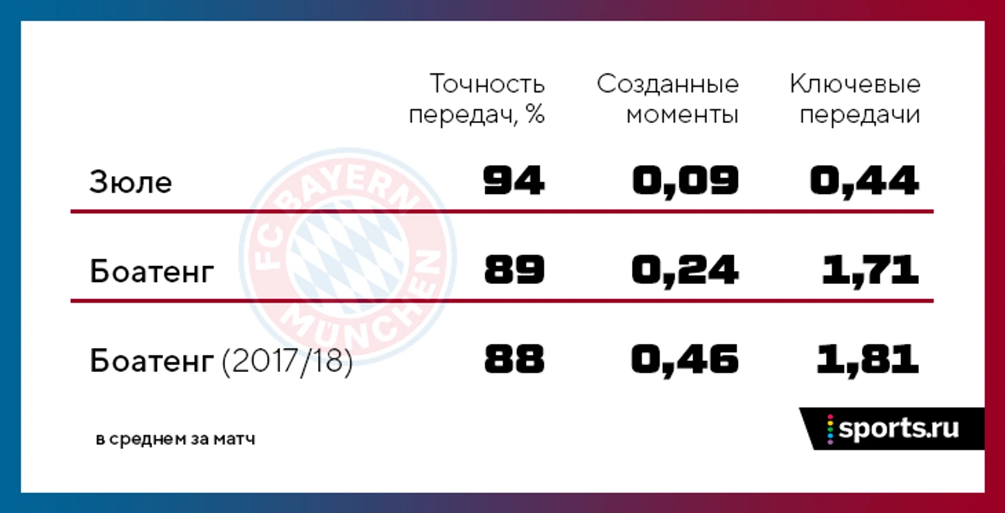 У Зюле достойные для добротного техничного защитника цифры, но Боатенг, даже в кризисном состоянии, в разы круче. Точность его передач чуть пониже (логично, ведь он выбирает более трудные варианты), но это многократно компенсируется прямым вкладом в атаки.