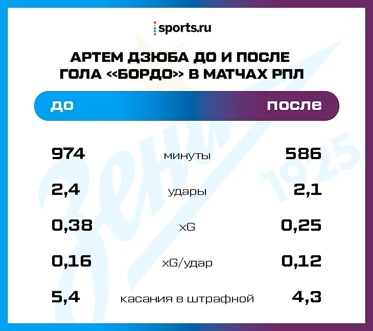 Тот гол в ворота «Бордо» стал для Дзюбы десятым в шестнадцати матчах сезона-2018/19 – начало действительно получилось очень крутым. В четырех играх (против «Арсенала», минского «Динамо», «Мольде» и «Локомотива») Артем совершал больше 8 касаний мяча в чужой штрафной – дикие цифры для российских нападающих. Теперь Дзюба редко оказывается в выгодных позициях, а Семака каждую неделю спрашивают о неудачной игре нападающего.