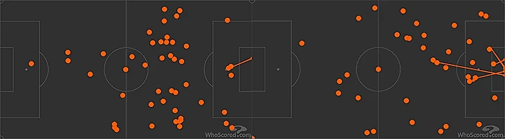 Против «Фенера» Дзюба не только сделал передачу на победный гол Азмуна, но и стал лидером «Зенита» по количеству передач в финальную треть. В матче с «Уфой» было точно так же: за 78 минут Дзюба (слева на карте) даже сделал на 10 касаний больше, чем Азмун.