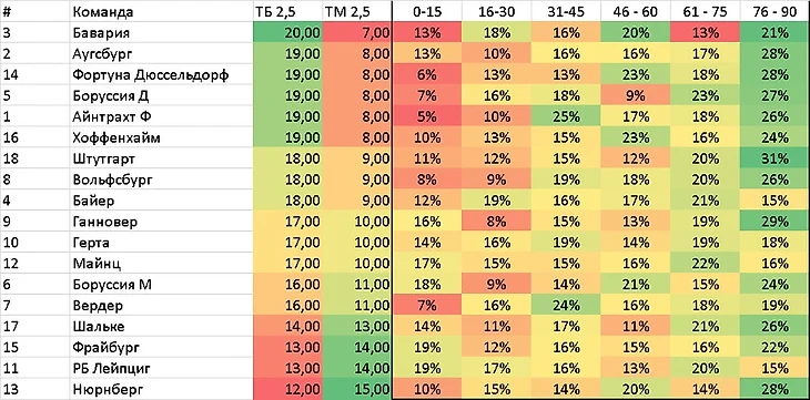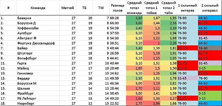 Оказалось, по крайней мере для Германии, это полная чушь. Смотрим таблицу ниже. В ней я привел статистику по каждой команде, сколько голов забивает/пропускает в этом интервале. А так же количество ТБ и ТМ за сезон.