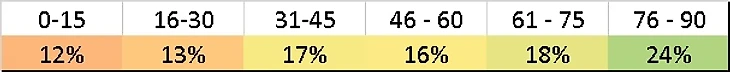 Далее близкие по значению интервалы с 61-75 и 31-45. В старте матча всего 12% от всех забитых голов.