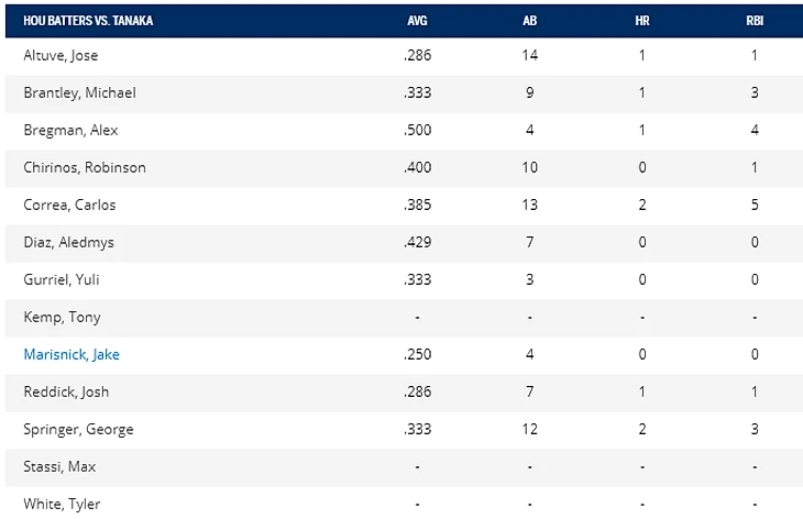Танака ужасен с Астрос, только Марисняк имеет меньше .286 отбиваемость против него. Корреа, Спрингер, Чиринос, Диаз, Брегман, Брантли, да и вообще все остальные рвут Танаку из раза в раз.