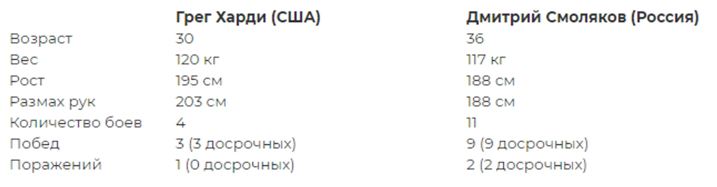 Одним из событий основного карда станет бой Грега Харди против Дмитрия Смолякова. Бывший игрок в американский футбол Харди начал профессиональную карьеру бойца и уже одержал несколько побед нокаутом. В послужном списке россиянина Смолякова чуть больше боев, но уровень оппозиции можно подвергнуть сомнению. Учитывая тот факт, что оба бойца побеждают исключительно досрочно, можно рассчитывать на нокаут и в их очной схватке. А наша задача — составить экспертный прогноз, чтобы сделать удачную ставку.