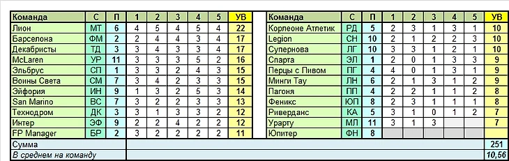 Лучшая команда тура по сумме УВ в целом: Лион (22 варианта)
