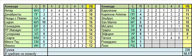 Лучшие игроки тура по УВ: Sun1974 (FP Manager), peacemaker88, Push692 (оба - Технодром), ДЗЕНЯ, ParaBellum, Zidane (все - Декабристы), DefJoint1995 (Пагоня), Barbadosec (Перцы с Пивом), Олег Нестеренко (Минги Тау), andzay, Alex20, Jack_Daniels, Wallker, Vadim Nakul (все - Интер), Михайловский технарь (Урарту), GraphM, богдан2005, sdryapko1 (все - Legion) - по 4 варианта