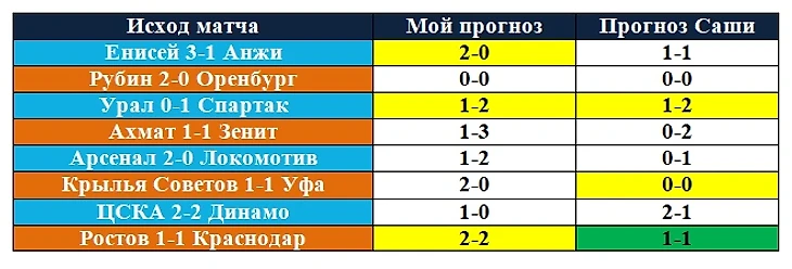 Очередная победа Саши в туре, общий счет стал 17-12. Зенит, как и Спартак в позапрошлом сезоне, стал чемпионом из-за осечки соперников. Ну, в смысле финальной точкой стала осечка соперников. Сине-бело-голубые в 28 туре играют дома против армейцев, следовательно, чтобы не расстраивать своих болельщиков, которые придут посмотреть на чемпиона, команда с берегов Невы обыграет ЦСКА, к сожалению одних и к радости других. Как минимум в одном матче уверенность уже есть.