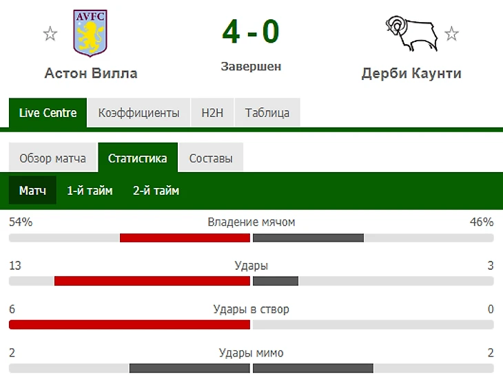 По моему мнению, единственный их шанс на успех в этой игре - шальной гол и защита всеми силами. Потому что “вилланы” их взломают, рано или поздно взломают, эта атака дважды занесла 3+ мяча, не уж то на 0 отстоят… когда в гостях Дерби пропускает 1.5 мяча за игру….