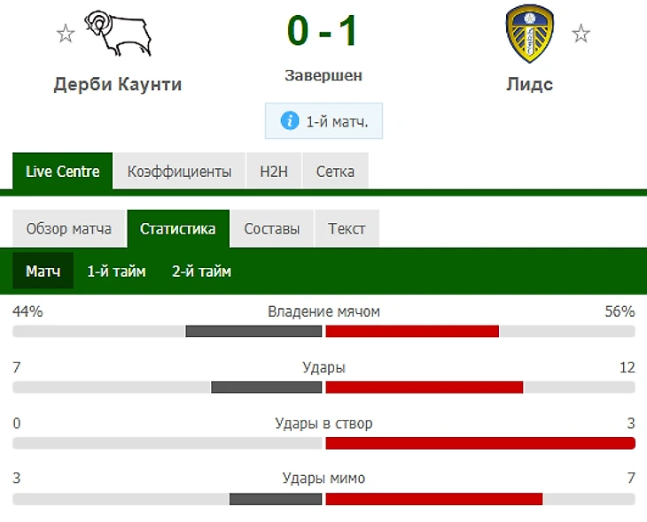 Я же хочу предостеречь всех кто на стороне Дерби - они того не стоят, там нет игры! Весь домашний матч с Лидсом в плейофф они отбивались и только чудо и Бэмфорд кривоногий с остальными рахитами не сделал счет того матча 0-5. Чего стоит вот эта красочкая статистика - 0 ударов в створ!