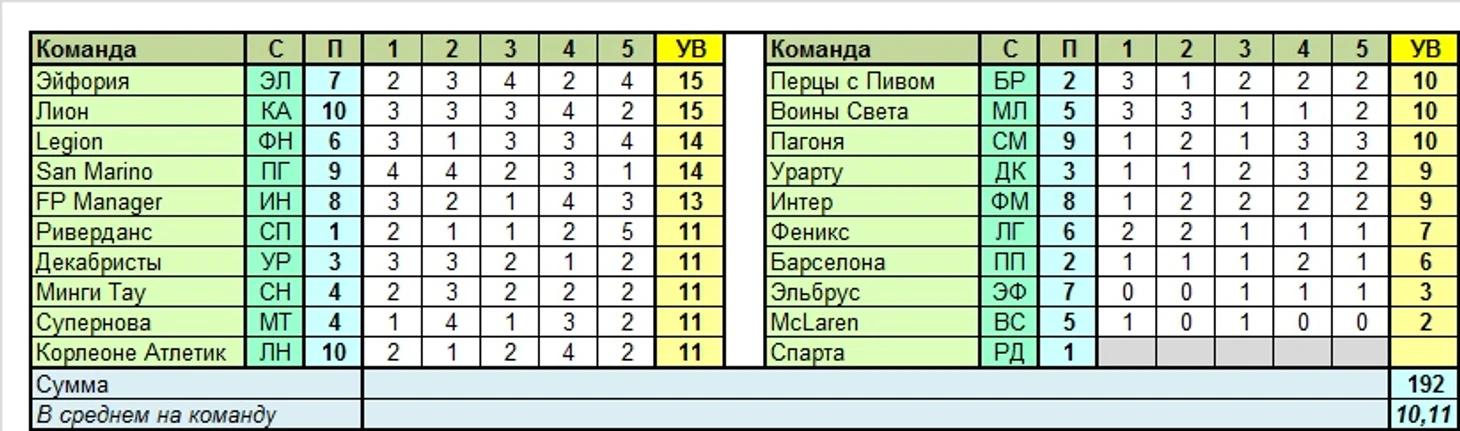 Лучшие команды тура по сумме УВ в целом: Эйфория, Лион (по 15 вариантов)