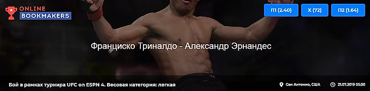 Опытный бразилец уже давно не хватает звезд с неба, а для молодого и перспективного американца Эрнандеса все в MMA только начинается. Триналдо успешно провел крайнюю схватку, одержав досрочную победу. Бой Эрнандеса тоже завершился досрочно — правда, его поражением. Кому улыбнется удача в этот раз? Попробуем составить экспертный прогноз для успешной ставки.