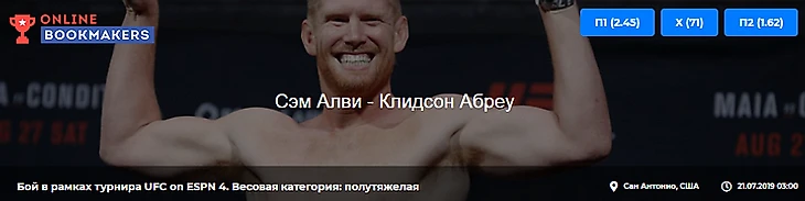 По мнению экспертов Online-Bookmakers.com, фаворитом этого противостояния является Клидсон Абреу. Умелый бразильский грэпплер превосходит своего соперника по качеству работы в партере и может успешно соперничать с ним в стойке. Два досрочных поражения Алви в двух последних схватках — неприятный «маячок» для американца. Больше читайте на online-bookmakers.com