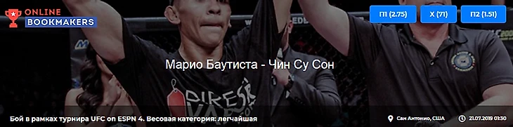 В своих дебютных схватках и Баутиста, и Сон проиграли. Только американец уступил досрочно, а боец из Кореи — по очкам. Болельщиков ожидает зрелищное противостояние грэпплера и ударника, успех в котором зависит от умения навязать оппоненту свой сценарий боя. А наша задача — составить экспертный прогноз, чтобы сделать выигрышную ставку.