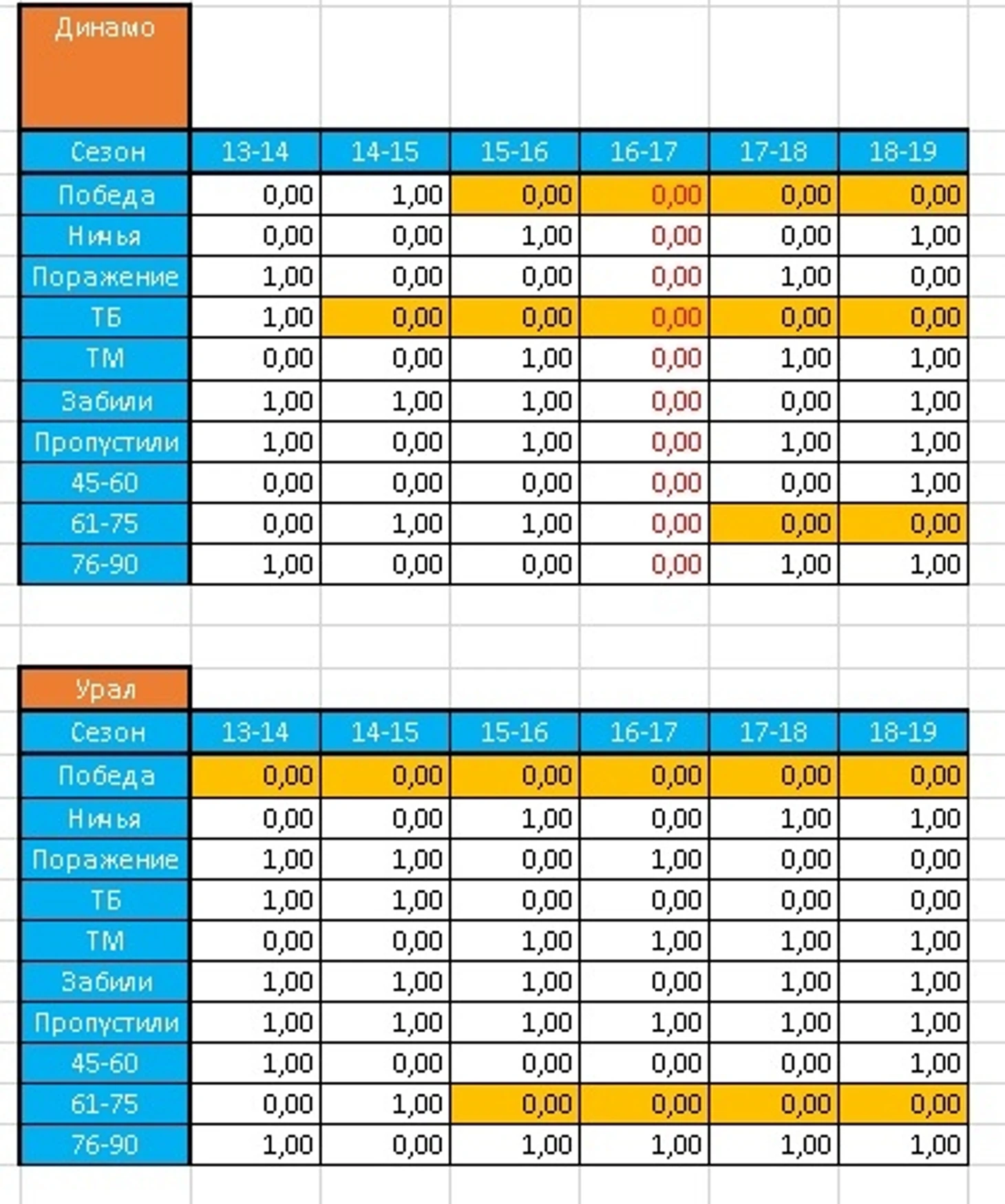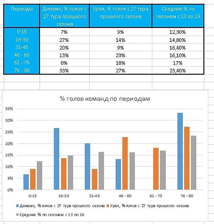 Еще в середине недели делал затравочку на тему матча Динамо и Урала и вообще голов по интервалам в РПЛ. Сегодня брать гол в интервале не стал, перестраховался. Но думаю многие на моем месте рискнули бы. Сегодня в матче «Динамо» - «Урал» можно было бы взять много ставок, но все они мне как то не очень нравятся кроме одной. «Динамо» давно без побед дома, учитывая статистику средних чисел, сегодня их победа более вероятна чем поражение. Еще и гол должны вроде как забить по теории вероятности. Но все это как то не то. Я писал на неделе об интервалах голов в определенные промежутки матча и увидел одну странную вещь у «Динамо». Команда, еще с прошлого сезона, начиная с 27 тура не может забить/пропустить в промежутке с 61 по 75 минуту. Казалось бы, что в этом такого удивительного? Посмотрите на таблицу с % голов Динамо и Урала с 27 тура прошлого сезона. А так же средние % по интервалам голов во всем чемпионате России с сезона 13-14 по сезоне 18-19.