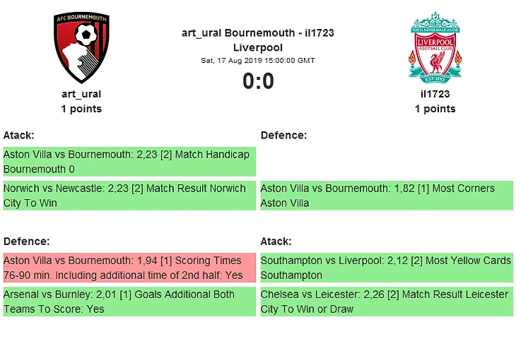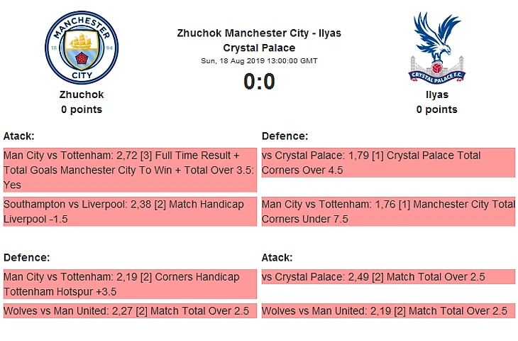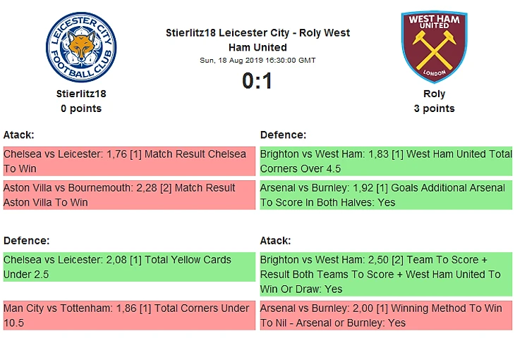 Чемпионы прошлых турниров Лестер Сити Stierlitz18 иВест Хэм Юнайтед Rolly в очном споре выяснят, кто из них ближе к борьбе за медали в этом сезоне..