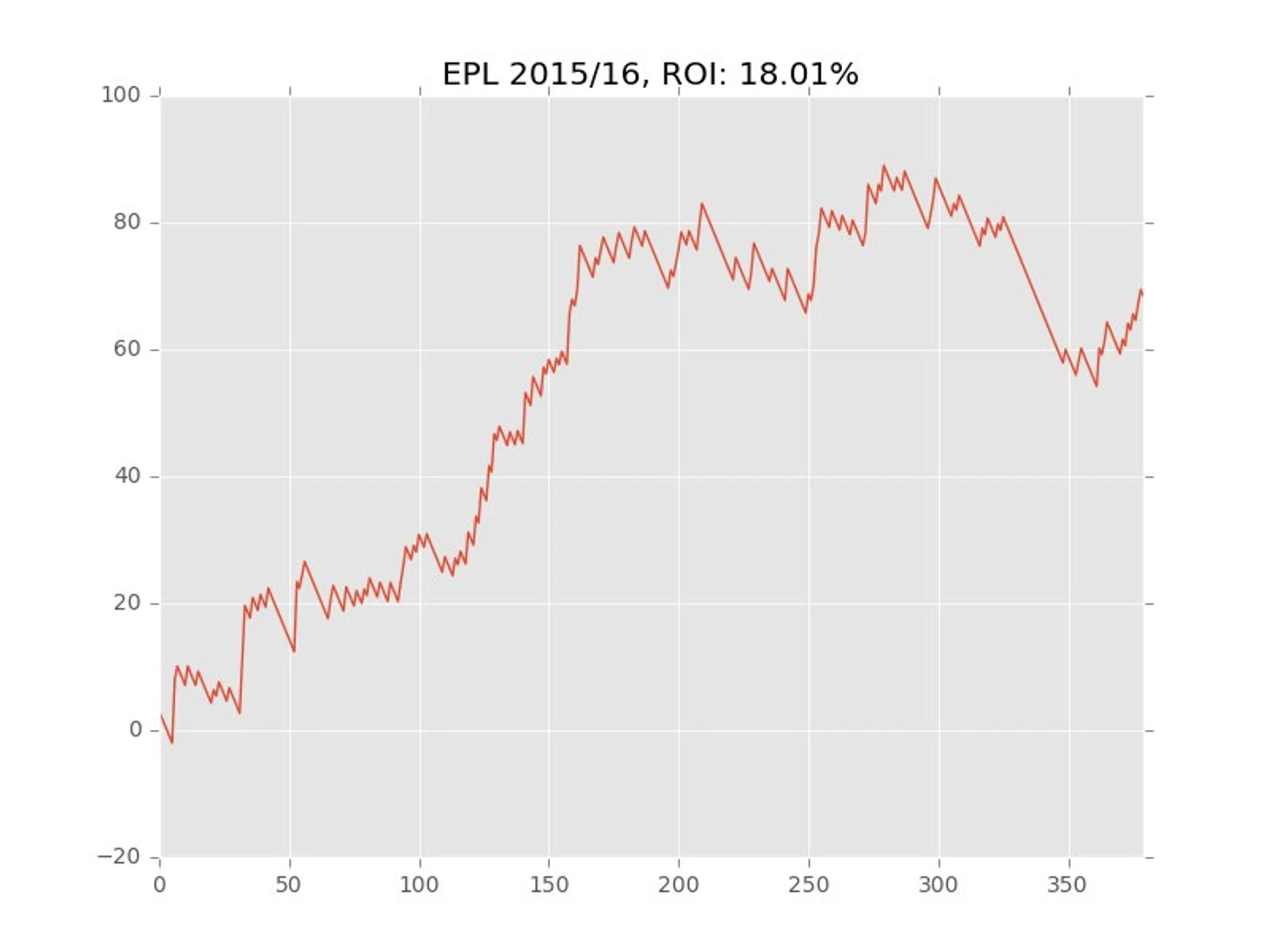 Поскольку для разработки стратегии я исследовал статистику АПЛ, то логично тестировать на сезоне АПЛ 15/16. Для этого посмотрим, сколько мы будем получать прибыли, делая ставку в 1 рубль на каждый матч.