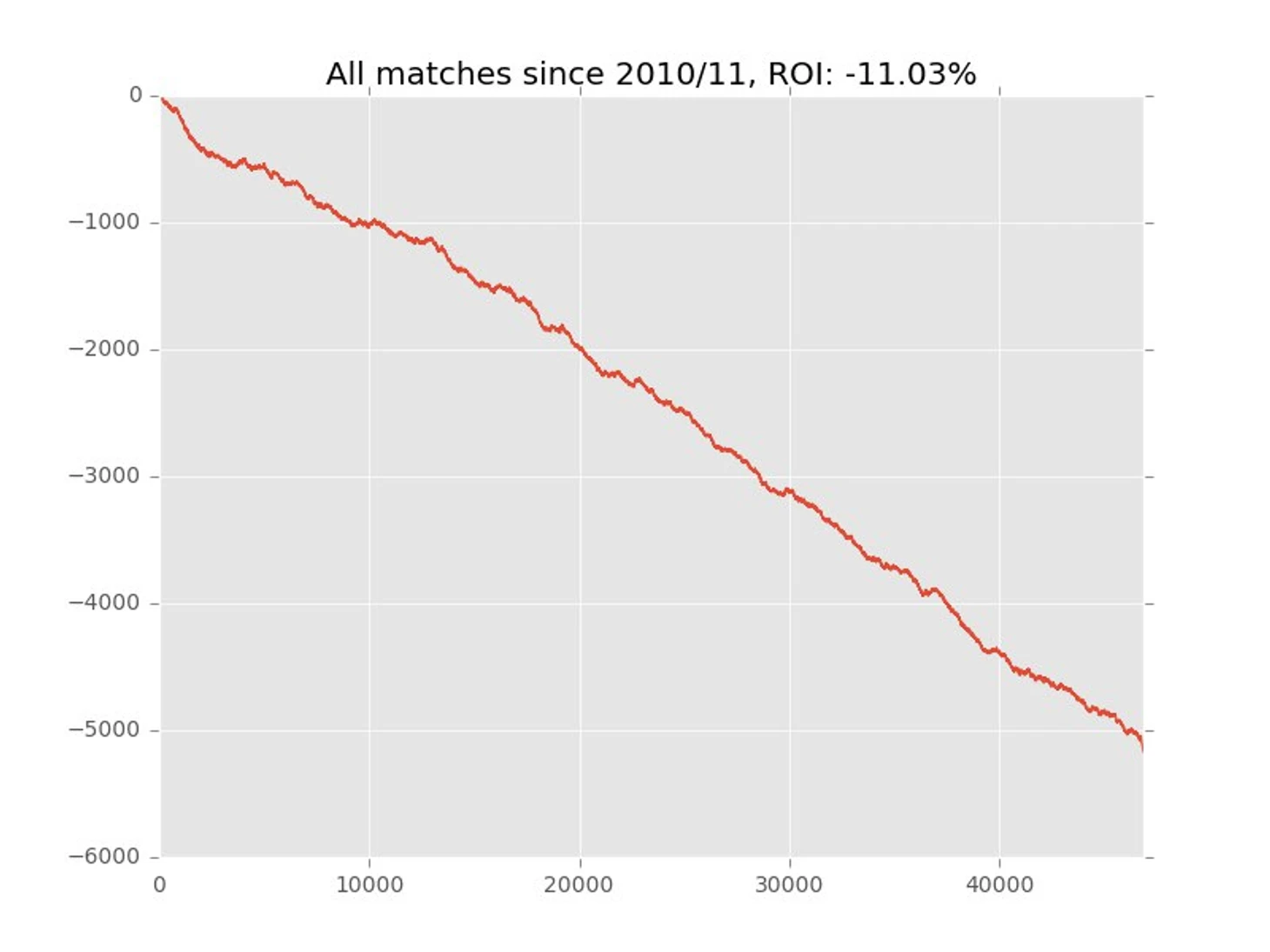 Если кто-то говорит, что делает ставки на основе статистики (особенно, если конкретно стратегию вы не понимаете), то подтверждать её эффективность надо не на 500 матчах и не 1000, а на нескольких десятках тысяч матчей. Подобные тесты, например, можно провести, используя статистику и котировки с сайта football-data.co.uk, с которого я и взял данные для приведённых графиков.